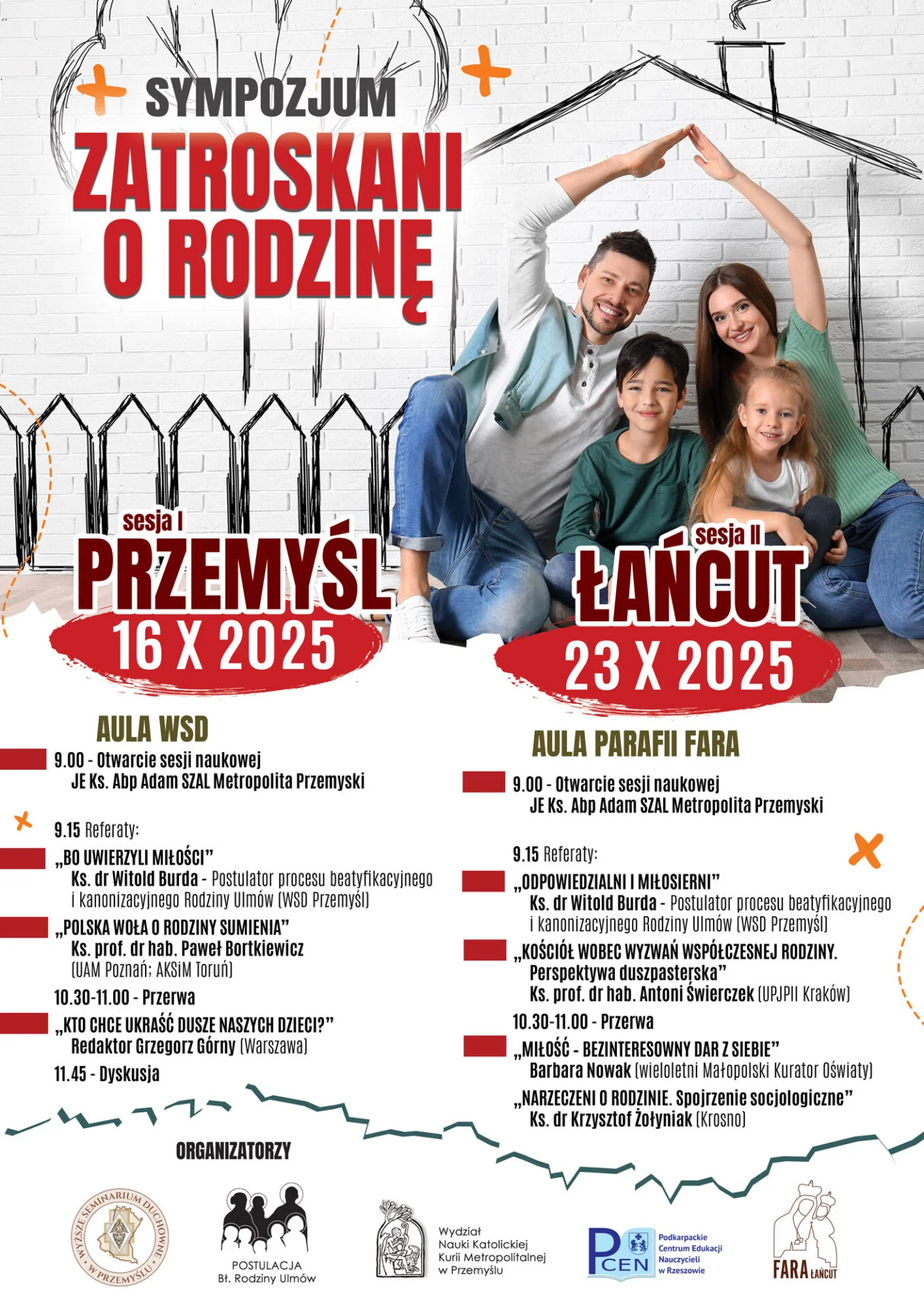 Wydział Nauki Katolickiej Kurii Metropolitalnej w Przemyślu, Wyższe Seminarium Duchowne w Przemyślu, Podkarpackie Centrum Edukacji Nauczycieli w Rzeszowie, Postulacja bł. Rodziny Ulmów i parafia Farna w Łańcucie, serdecznie zapraszają na sympozjum „Zatroskani o rodzinę”.