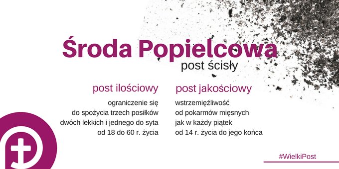 W Środę Popielcową (18.02) obowiązuje post ścisły, tzn. post jakościowy, czyli wstrzemięźliwość od pokarmów mięsnych (wszystkich, którzy ukończyli 14. rok życia) oraz post ilościowy, czyli ograniczenie się do spożycia trzech posiłków: dwóch lekkich i jednego do syta (wszystkich wiernych, którzy ukończyli 18. rok życia, a nie rozpoczęli 60.). Mimo tego przepisu rodzice powinni jednak zatroszczyć się, aby również dzieci były wprowadzane w autentycznego ducha pokuty.